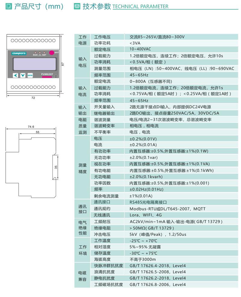 PUMG307系列三相導軌式智能電力能效終端采用DIN35mm 導軌式安裝結構和LCD液晶屏顯示,集三相電參量測量、2~31次諧波分析、時間統計等于一體,標配1路RS485通訊接口,可通過Modbus-RTU或DL/T645-2007通訊協議實現儀表的網絡化管理。還可擴展2路開關量輸入 和2路 繼 電 器 輸 出 , 可 外 接 開 口 式 互 感 器 易 于 改 造 項 目 的 施 工 。PUMG307具有體積小巧,精度高,可靠性好,安裝方便等優點,多用于系統集成、改造工程、安裝空間有限或不便的項目。