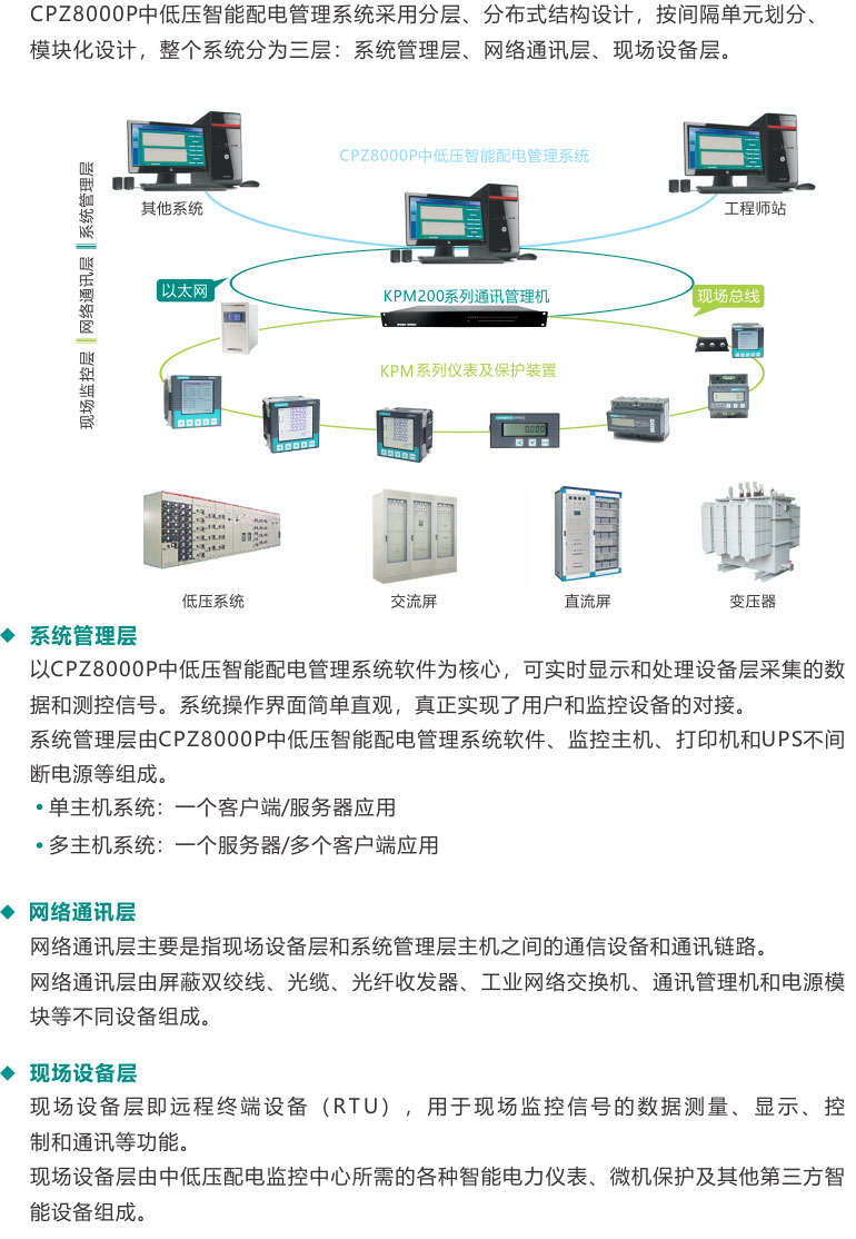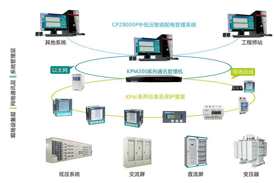 CPZ8000P中低壓智能配電管理系統(tǒng)采用分層、分布式結(jié)構(gòu)設(shè)計,按間隔單元劃分、模塊化設(shè)計,整個系統(tǒng)分為三層:系統(tǒng)管理層、網(wǎng)絡(luò)通訊層、現(xiàn)場設(shè)備層。