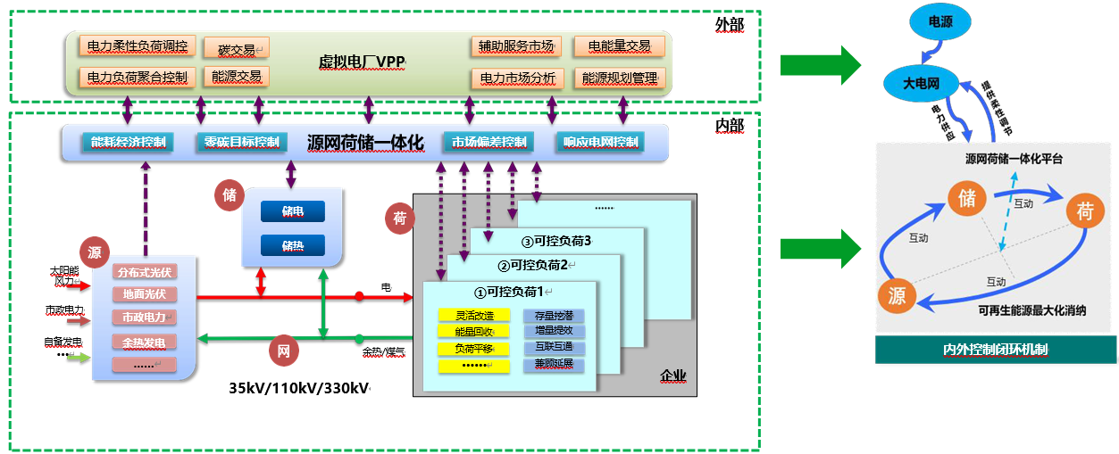 n 彈性調度:以虛擬電廠與電網的分界線,對內構建完整的系統閉環,通過儲能調節、源荷互動及柔性負荷響應等,實現安全用電和可再生能源的最大化消納;