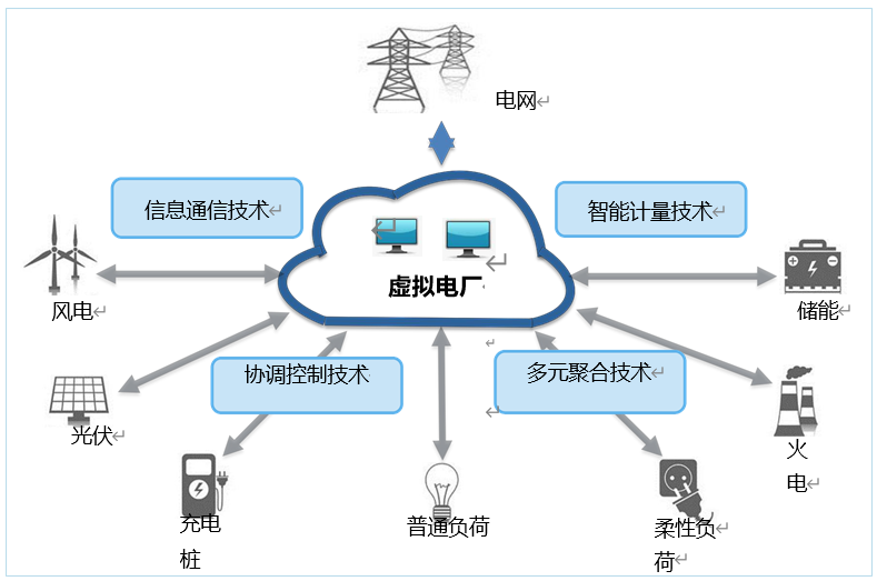 通過智能調控、通信技術整合各種形式的分布 式發電、負荷、儲能等資源,作為一個調控性能好的“虛擬電廠”來參與電力供需調節。