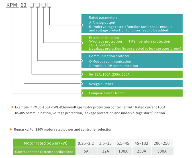 KPM60 series low-voltage motor protection controller is suitable for control protection circuit that rated voltage 380-660V, rated current 5-500A, providing a sound protection and control measures. It could achieve motor network management.