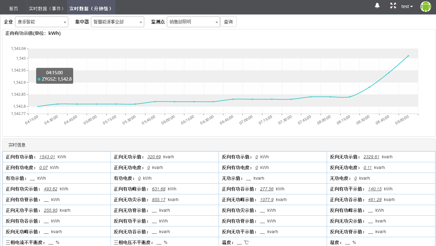 分鐘級實時數據主要展示所采集的用電設備四象限電能、復費率電能統計、電流不平衡率、電壓不平衡率、溫度和濕度等數據,每15分鐘刷新一次。選擇集中器,選擇監測點,點擊查詢就會調出當前用能設備分鐘級實時數據,點擊數據變量,就會生成與之相對應的實時曲線,通過曲線查看數據情況,進而了解設備用能及運行情況。