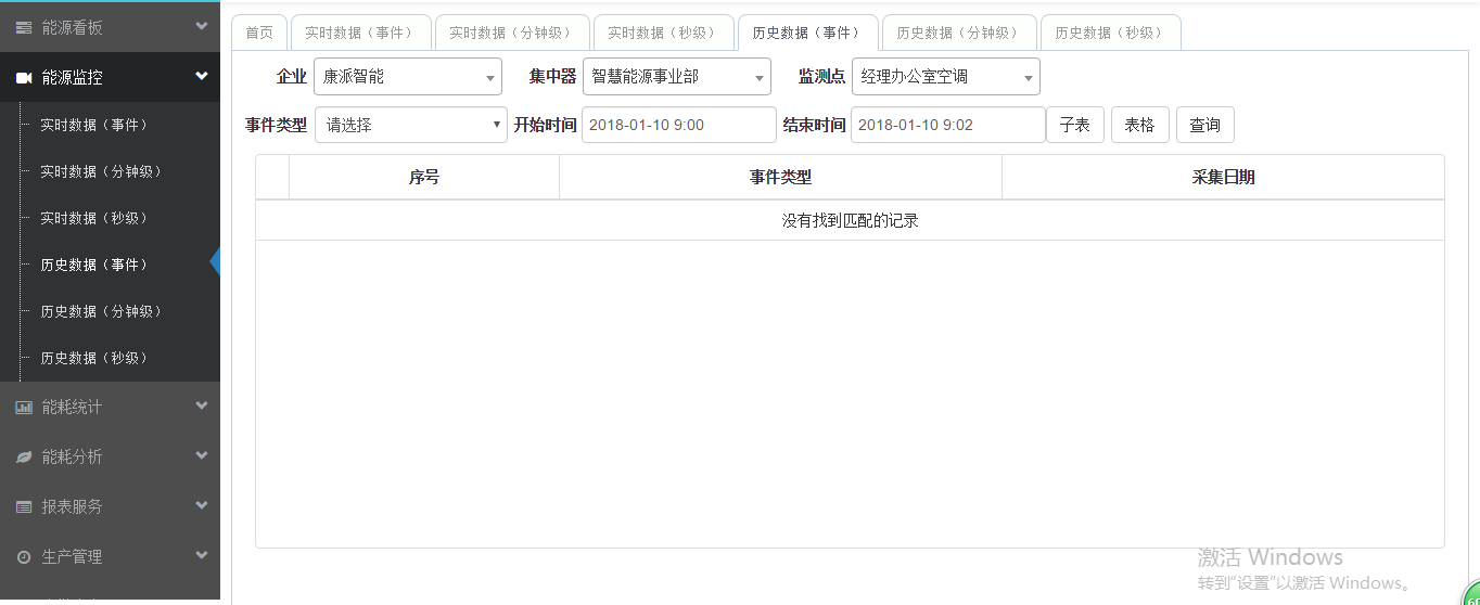 現場設備有歷史遙信變位、歷史越限告警和歷史故障報警時,會在歷史數據(事件)中查到,選擇集中器,選擇監測點,選擇事件類型,時間段,點擊查詢就會調出如下圖所示當前用能設備歷史事件記錄。