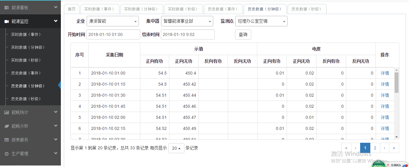 分鐘級歷史數據可以在歷史數據(分鐘級)中查到,選擇集中器,選擇監測點,選擇時間段,點擊查詢就會調出如下圖所示當前用能設備分鐘級歷史數據記錄。通過查看不同時間的分鐘級歷史數據,可以了解設備用能情況,對月、季、年能耗分析起著重要作用。