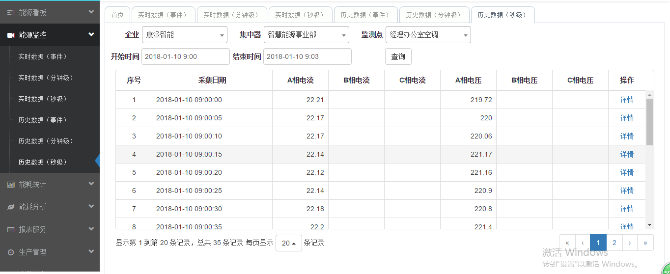 秒級歷史數據可以在歷史數據(秒級)中查到,選擇集中器,選擇監測點,選擇時間段,點擊查詢就會調出如下圖所示當前用能設備秒級歷史數據記錄。通過查看不同時間的秒級歷史數據,可以了解設備運行情況,當有故障發生,通過查看歷史數據,可以初步判斷問題所在,縮小排查范圍,對設備維護起著重要作用。