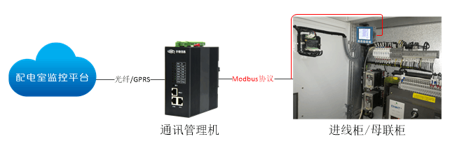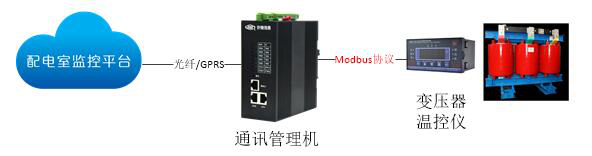 通過變壓器溫控器采集變壓器三相鐵芯的溫度,及啟停變壓器的風機,有油位傳感的可以檢測油位,對于調容調壓配電變壓器,可以實現調容調壓的操作和檢測;變壓器溫控器通過Modbus通訊協議將溫度信號傳至通訊管理機。