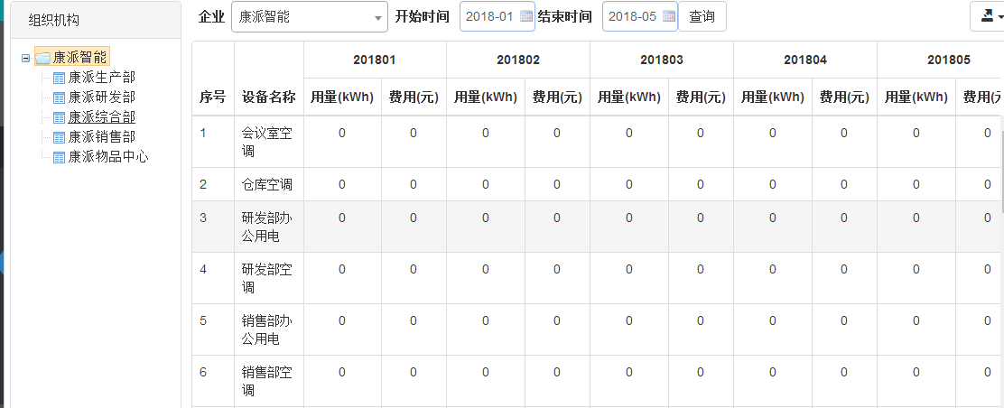 在年報表界面上方選擇開始時間和結束時間,在組織機構里選擇需要查詢的部門,點擊查詢按鈕,會顯示如下圖所示月報表界面,界面中包含用電回路的名稱、日期、用電量及費用。用電量為該回路在查詢起止日期時間段內該月的用電量,每年月電費累計起來即為當年應繳的用電費用。