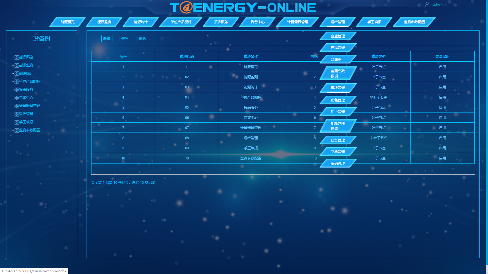 企業管理、產品管理、監測點、監測點數據項、模塊管理、角色管理、用戶管理、能耗越限設置、任務管理、字典管理、編碼管理;