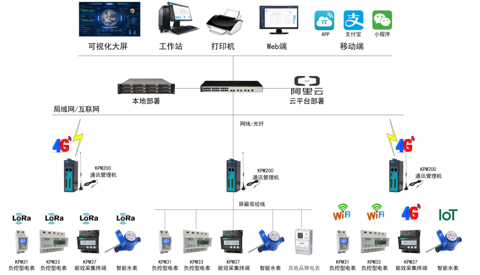 現(xiàn)場(chǎng)采用RS485、以太網(wǎng)GPRS、4G、NB-ot.lora、 Zigbeeifi等傳輸方式,將區(qū)域內(nèi)的電力采集模塊連接至相對(duì)的通訊管理機(jī);各通訊管理機(jī)通過用戶局域網(wǎng)連接至中央服務(wù)器。
