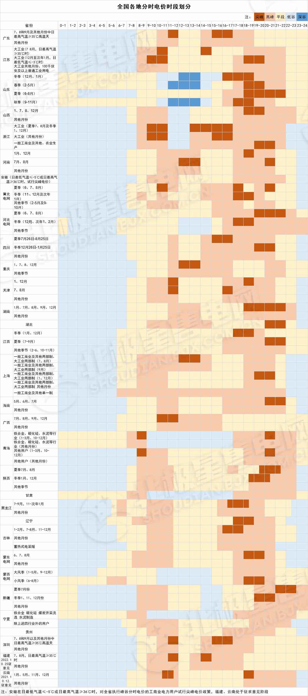 全國各地分時電價時段劃分情況