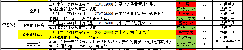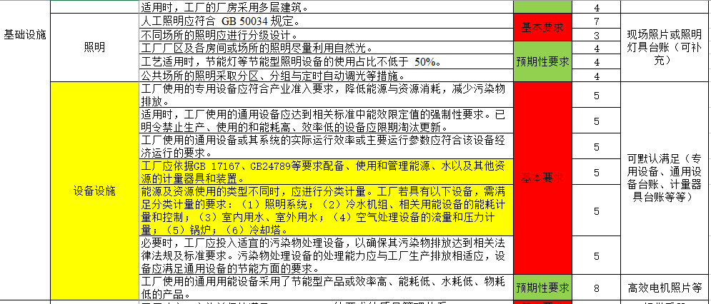 從認證評價表中可以看到與基本要求和預期性要求等相關要求,綠色工廠通過與否,并不是完全看分值的高低,基本要求項都必須滿足的基礎上再看總分值。其中與能源管理相關的主要有以下幾方面的內容: