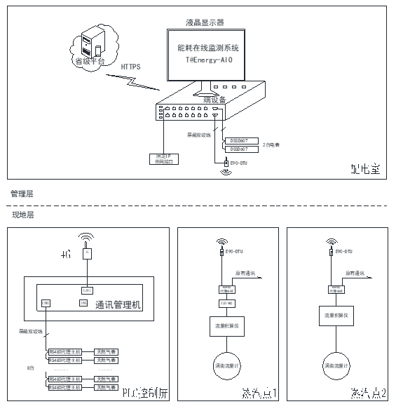 方式二:增加一套蒸汽流量計,該流量計具備通訊功能,單獨用于能耗在線監測系統。配套設備有無線Lora,將表計的RS485口接入無線Lora模塊, Lora模塊將數據傳輸至端設備。