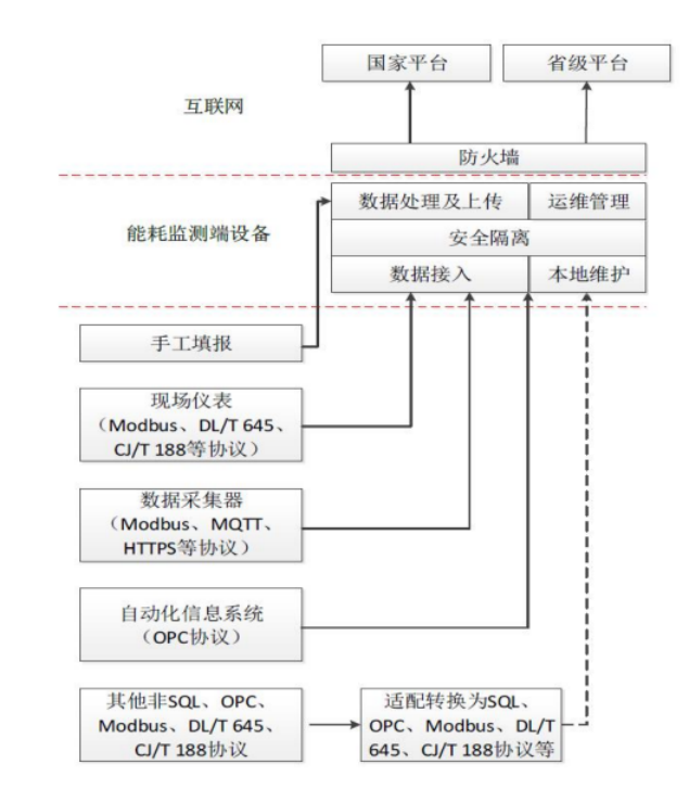 ①支持從現場的儀表獲取數據:通過 Modbus(GB/T19582)、 DL/T645、CJ/T188 協議,從現場儀表采集需要的能耗實時數據,并進行匯總生成上報的能耗數據;